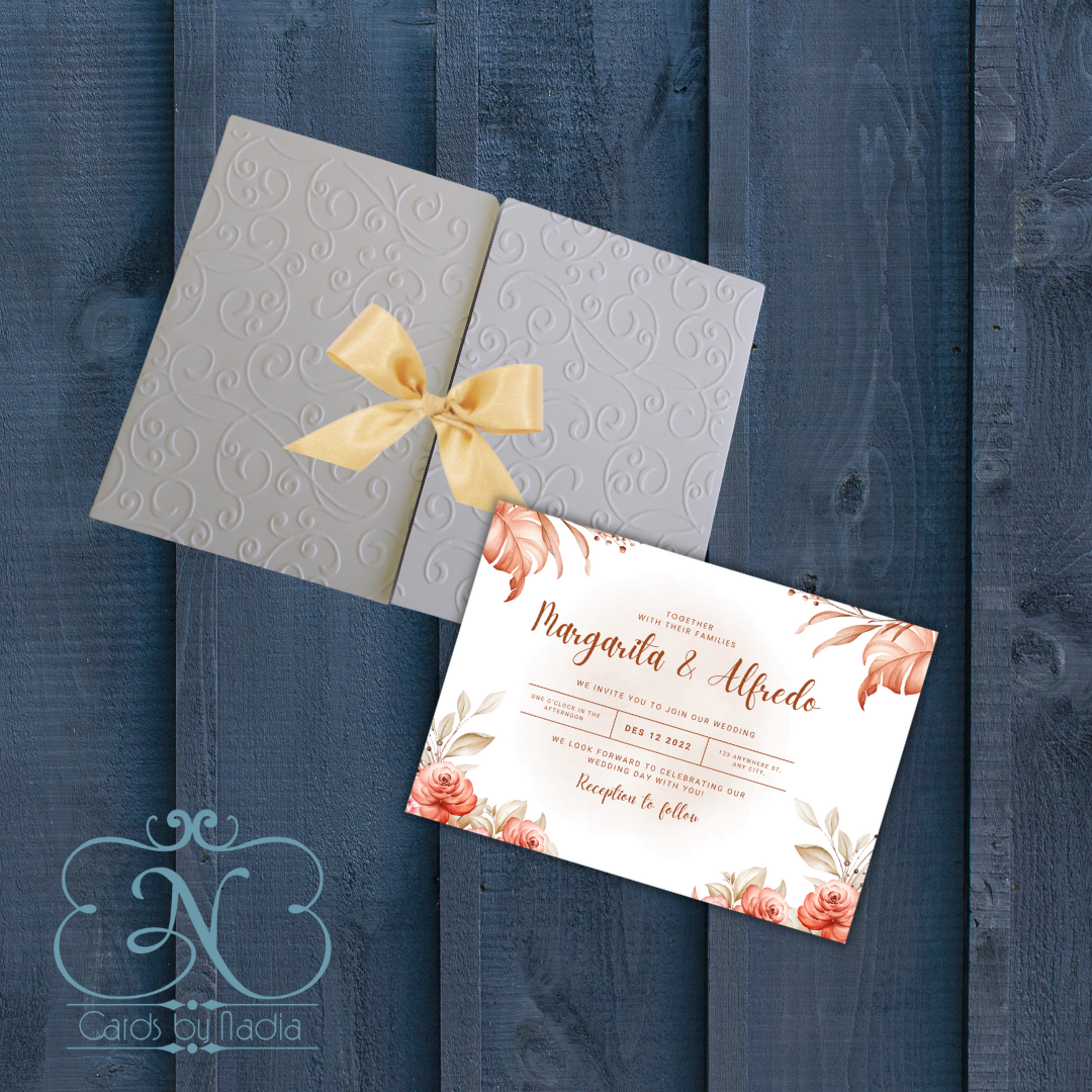 Choose one of our existing templates or simply browse through hundreds of Artwork and customise it according to your requirements. Various fonts and objects are at your disposal. Once all your details have been entered, you can either check out with the quantity you would like to have printed, or you can continue shopping for a suitable cover or envelope. Make sure the envelope you choose fits the size of the card. This Card size fits most of our Lasercut covers We recommend that you use the 13x13cm size template for our plain square and embossed covers pockets.