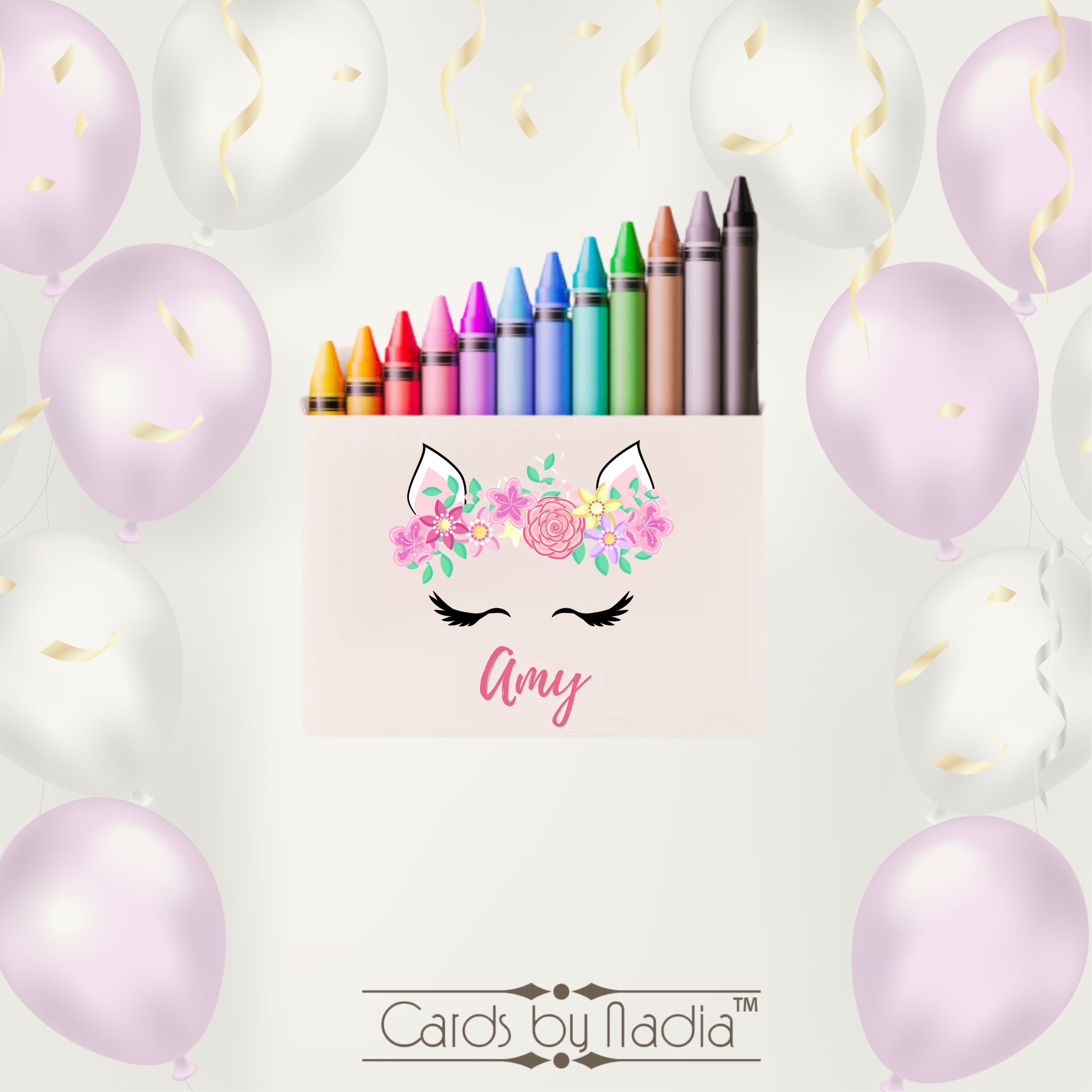 These personalised crayon box includes 12 crayons. each crayon is also personalised individually.
